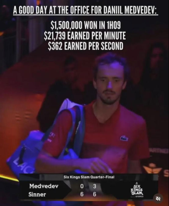 观看了直播的球迷也忍不住吐槽:150万美元出场费,70分钟吞蛋告负,梅总这钱真好赚!更是有球迷根据他的出场时间计算,即每分钟价值21739美元,平均每秒赚362美元。首场比赛取得完胜的辛纳在半决赛中将对阵德约科维奇。