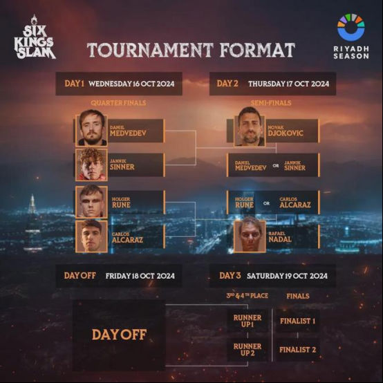 高额的出场费吸引了德约科维奇、纳达尔、阿尔卡拉斯、辛纳、梅德维德夫与鲁内六位ATP顶尖选手共同组成豪华阵容,在首日进行的两场比赛中由辛纳对阵梅德维德夫、阿尔卡拉斯对阵鲁内。